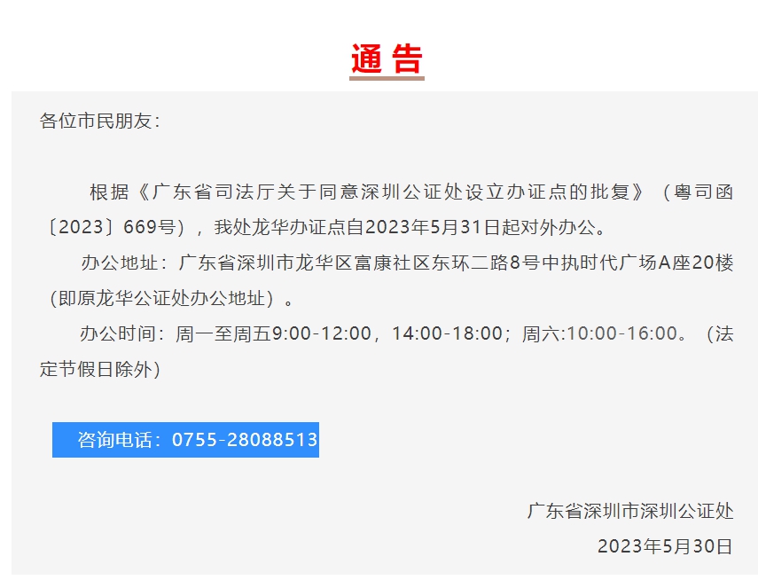 各位市民朋友:根據(jù)《廣東省司法廳關(guān)于同意深圳公證處設(shè)立辦證點(diǎn)的批復(fù)》(粵司函〔2023〕669號(hào)),我處龍華辦證點(diǎn)自2023年5月31日起對(duì)外辦公。辦公地址:廣東省深圳市龍華區(qū)富康社區(qū)東環(huán)二路8號(hào)中執(zhí)時(shí)代廣場(chǎng)A座20樓(即原龍華公證處辦公地址)。辦公時(shí)間:周一至周五9:00-12:00,14:00-18:00;周六:9:00-12:00,14:00-16:00。(法定節(jié)假日除外)咨詢(xún)電話:0755-28088513廣東省深圳市深圳公證處2023年5月30日